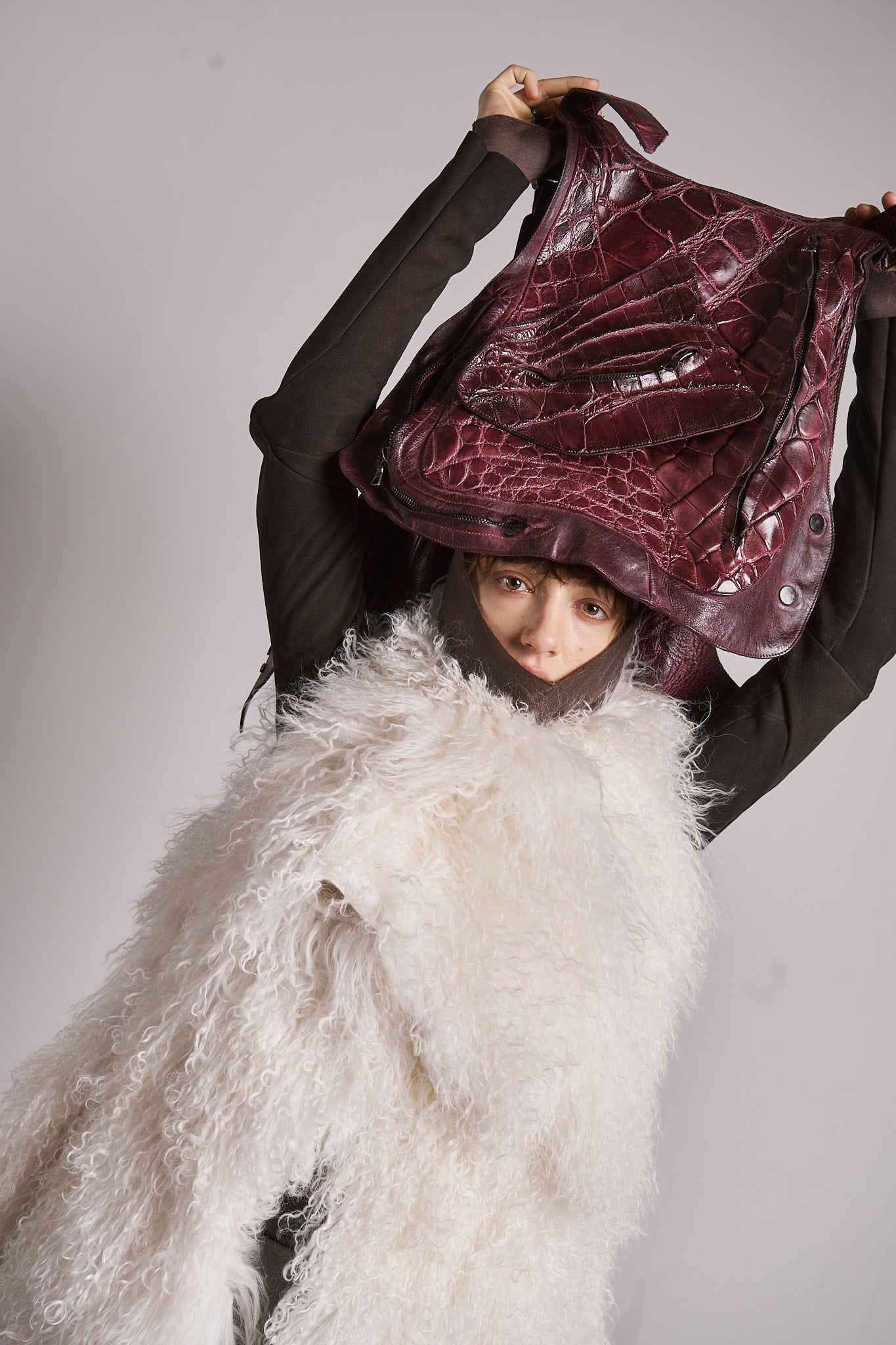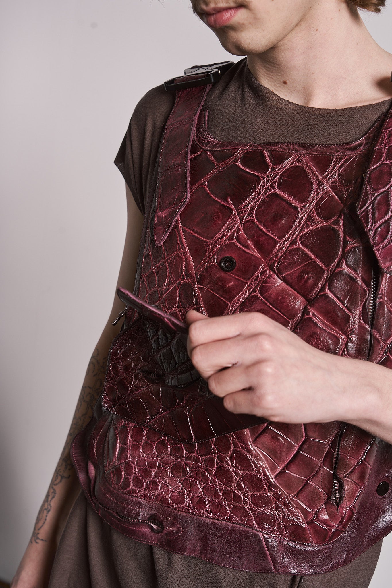 A PLATE CARRIER - A UTILITARIAN WAISTCOAT WITH AMPLE POCKETS WITH THE OPTION TO BE EQUIPPED WITH CERAMIC PLATES FOR A REAL BULLET RESITANCE. MADE OUT OF WILD ALLIGATOR AND GERMAN HORSE LEATHER. FEATURING THREE ZIPPED COMPARTMENTS, DETACHABLE FRONT AND OUR SIGANTURE TEARDROP PULLER. AVAILABLE IN RUBIN, AS PRESENTED AND BLACK.