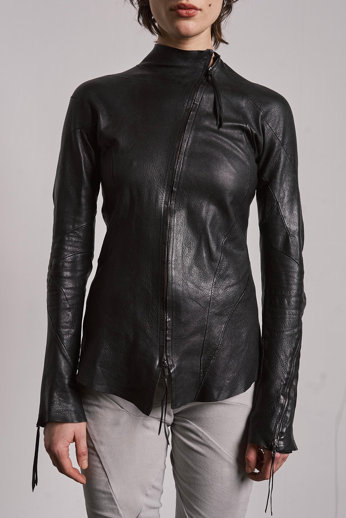DRESS SHIRT IN A BLACK GOAT LEATHER. FEATURING CURVED RIRI TWO-WAY METAL ZIPPER AND ZIPPER IN SLEEVES.