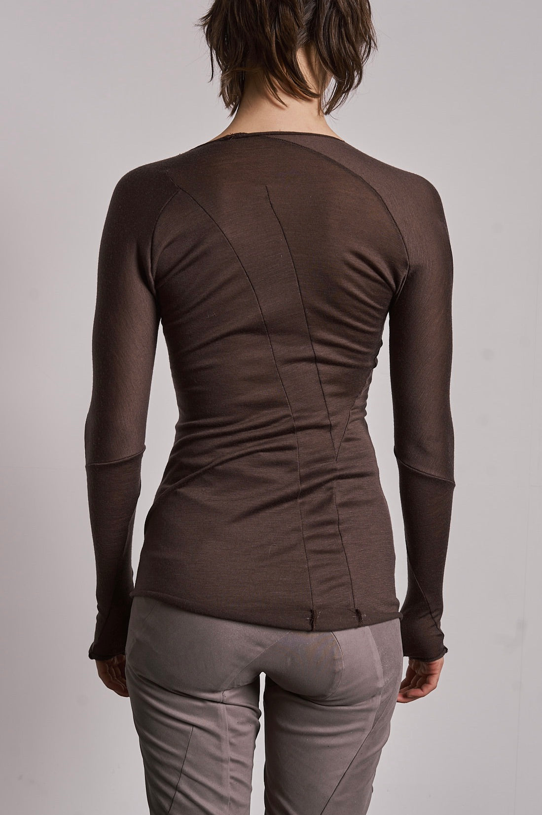 LANA WOOL JERSEY LONG SLEEVE FEATURING GLOVED SLEEVES AND A ROUND NECKLINE. AVAILABLE IN BROWN, AS PRESENTED AND BLACK.
