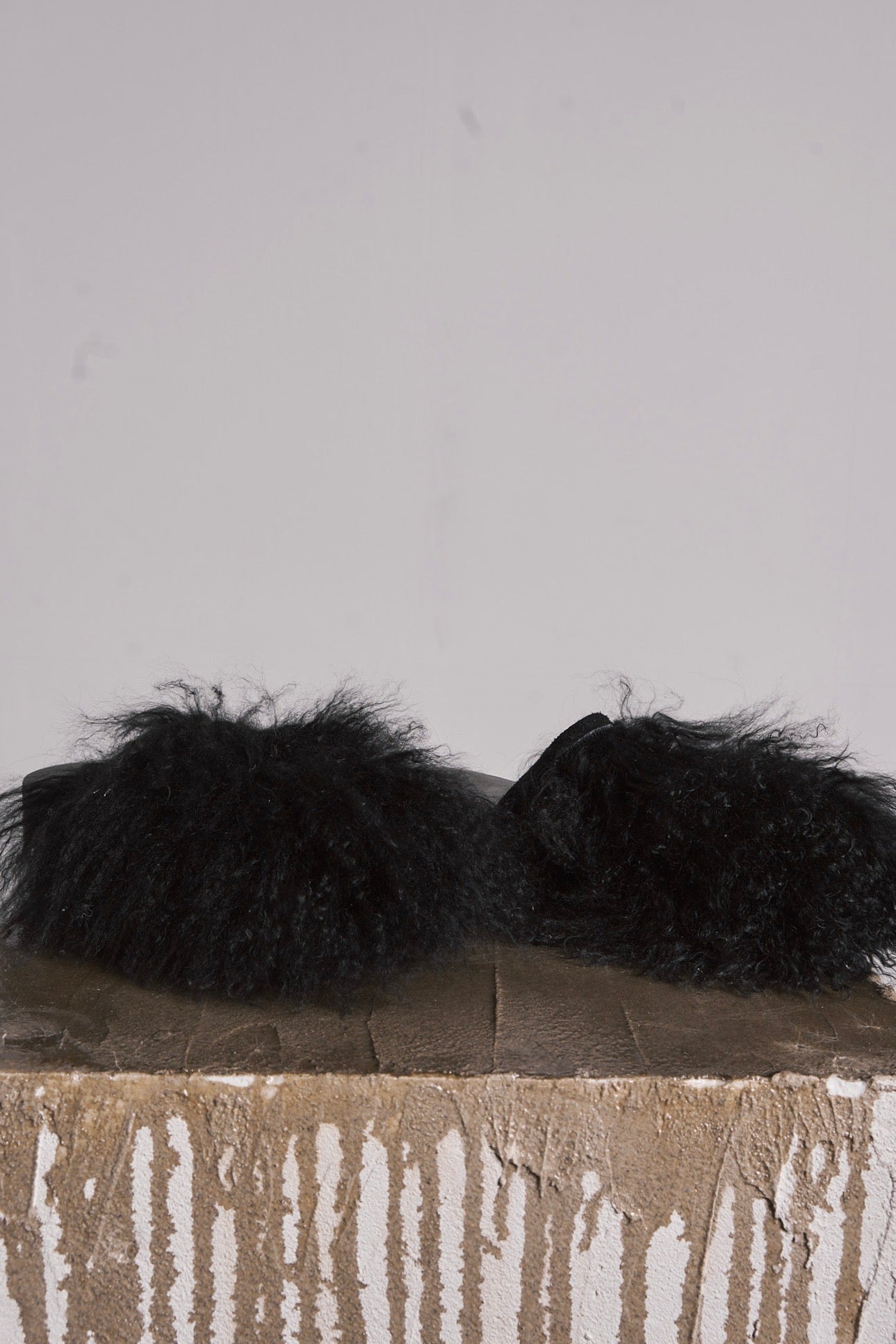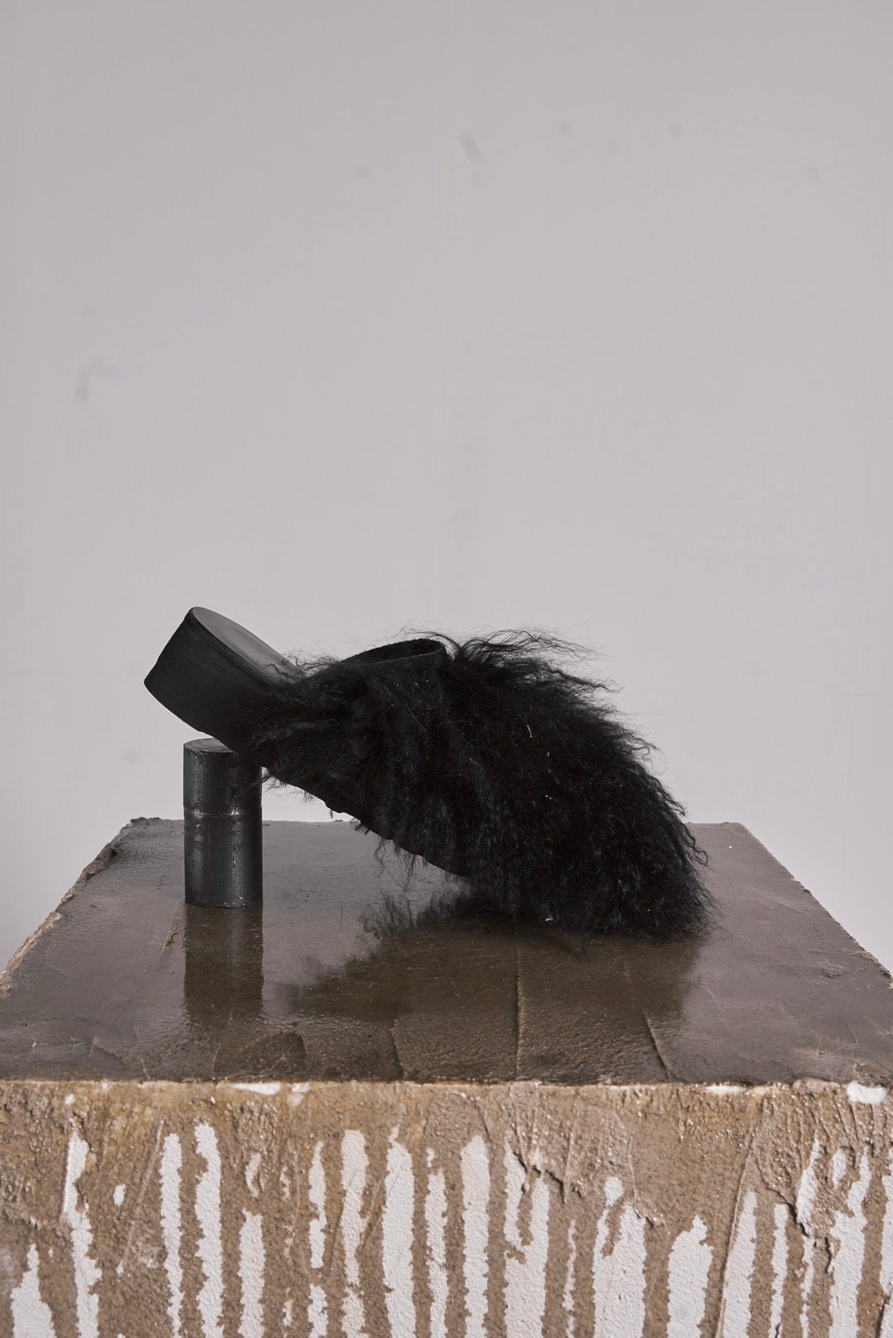 OUR MULE IN LONG HAIR CURLY LAMB LEATHER WITH OVERSIZED VIBRAM SOLE AND ROUND TOE.