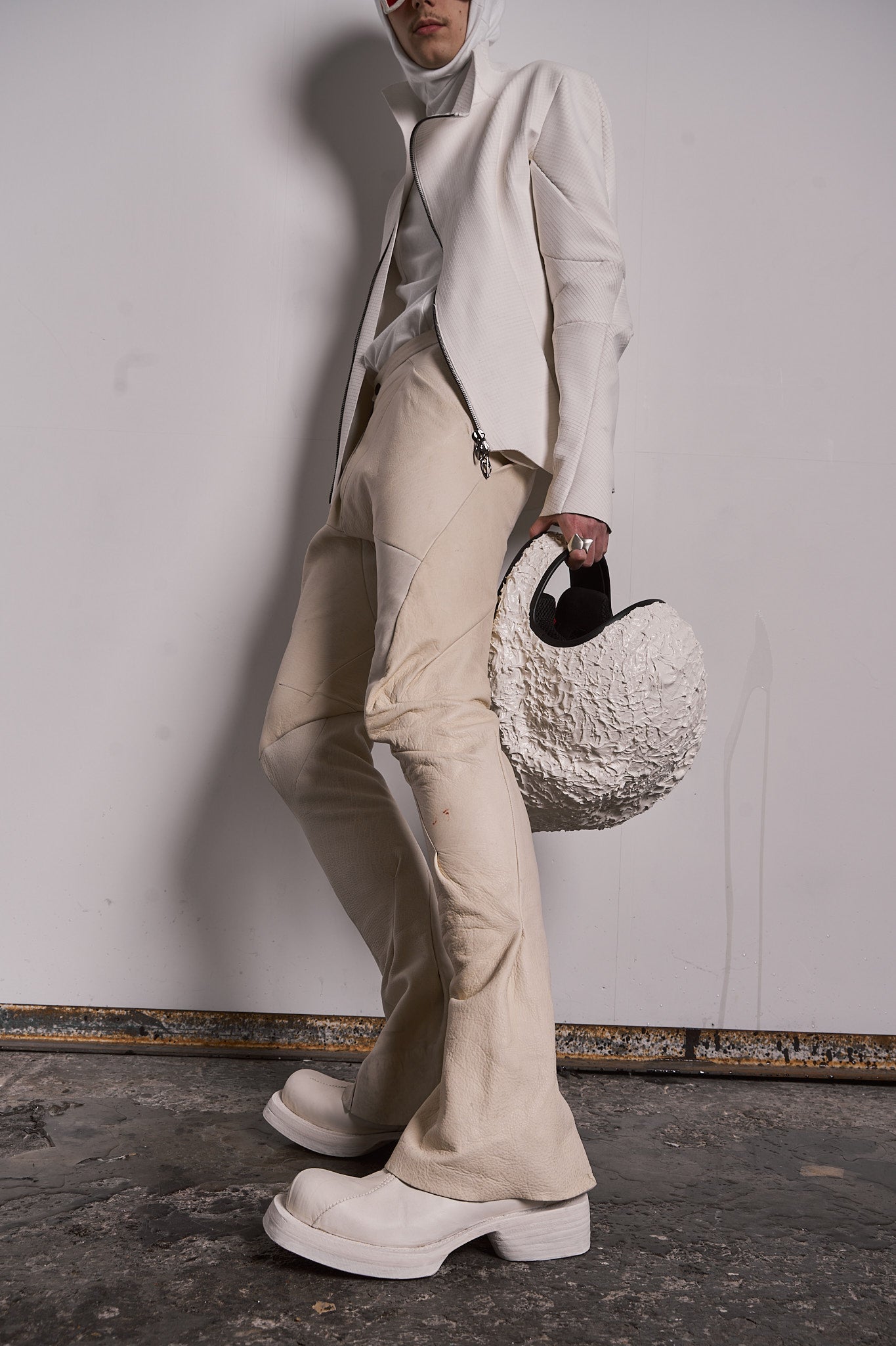 HORSE LEATHER PANTS FEATURING AN ELONGATED FLARED LEG OPENING. WITH RIRI METAL ZIPPER AND BUTTON CLOSURE, TWO SIDE AND ONE BACK POCKET. AVAILABLE IN OFF-WHITE. AS PRESENTED AND BLACK.